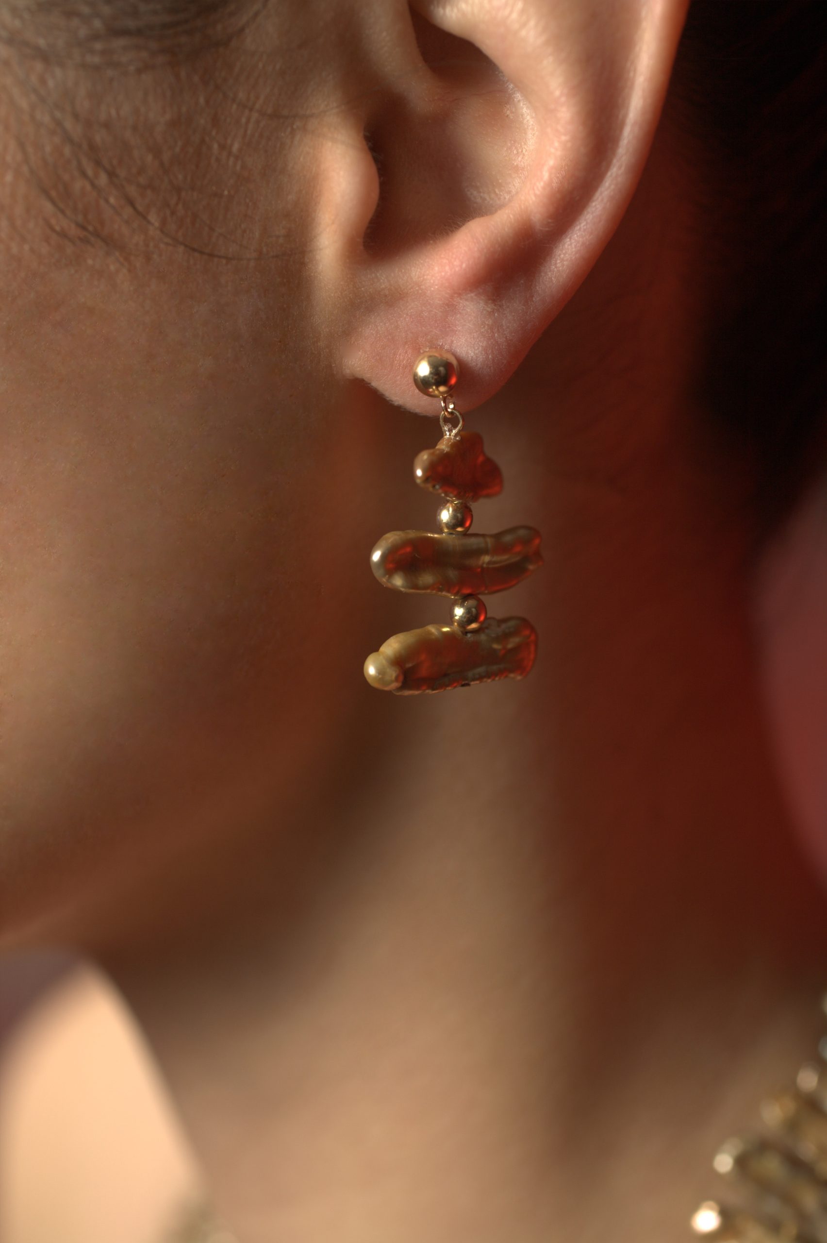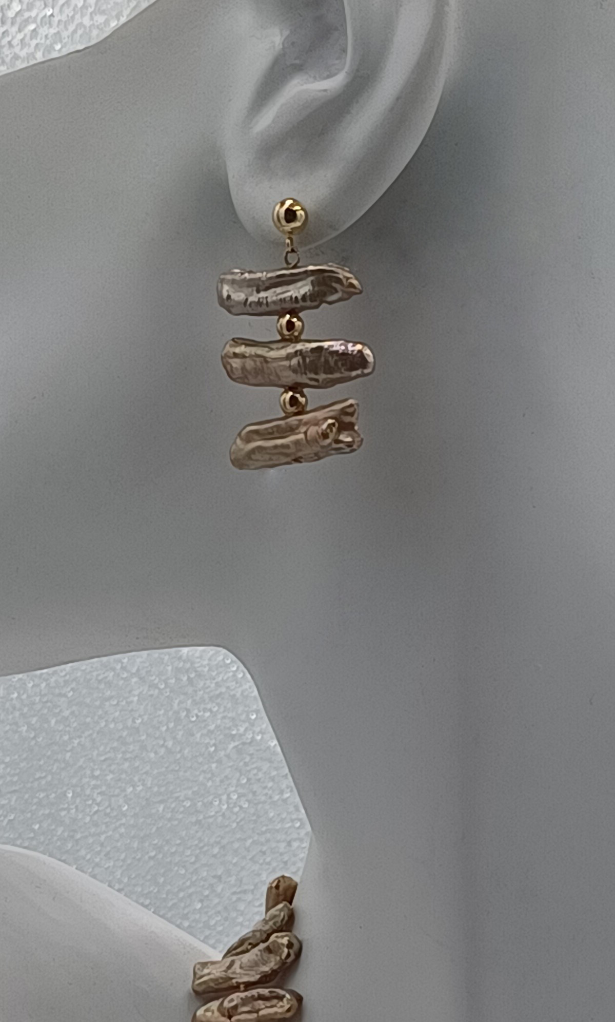 Astoundingly beautiful. 3 golden Biwa cultured pearls with 2 – 14kt gold bead stations.