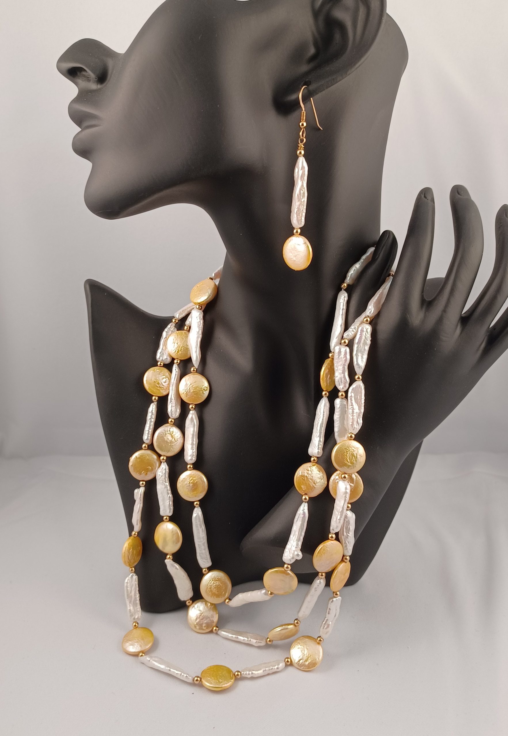 3 -Strands of 18.0 – 27.0mm white Biwa, luscious 14.0mm yellow cultured coin pearls with