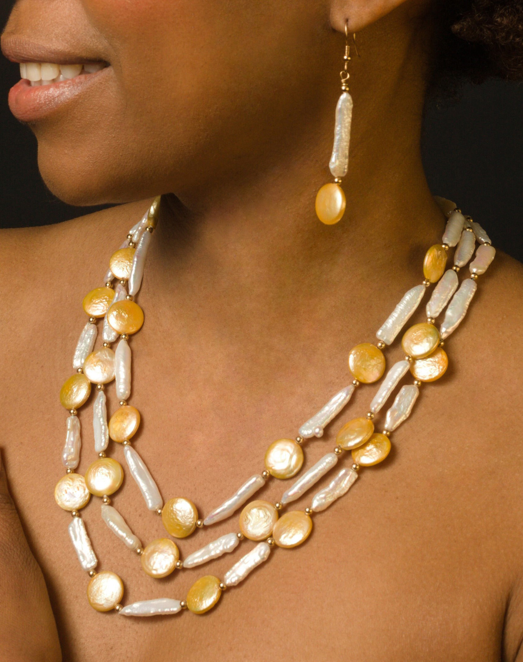Lauren Triple Strand White Biwa & Yellow Coin Pearl Necklace