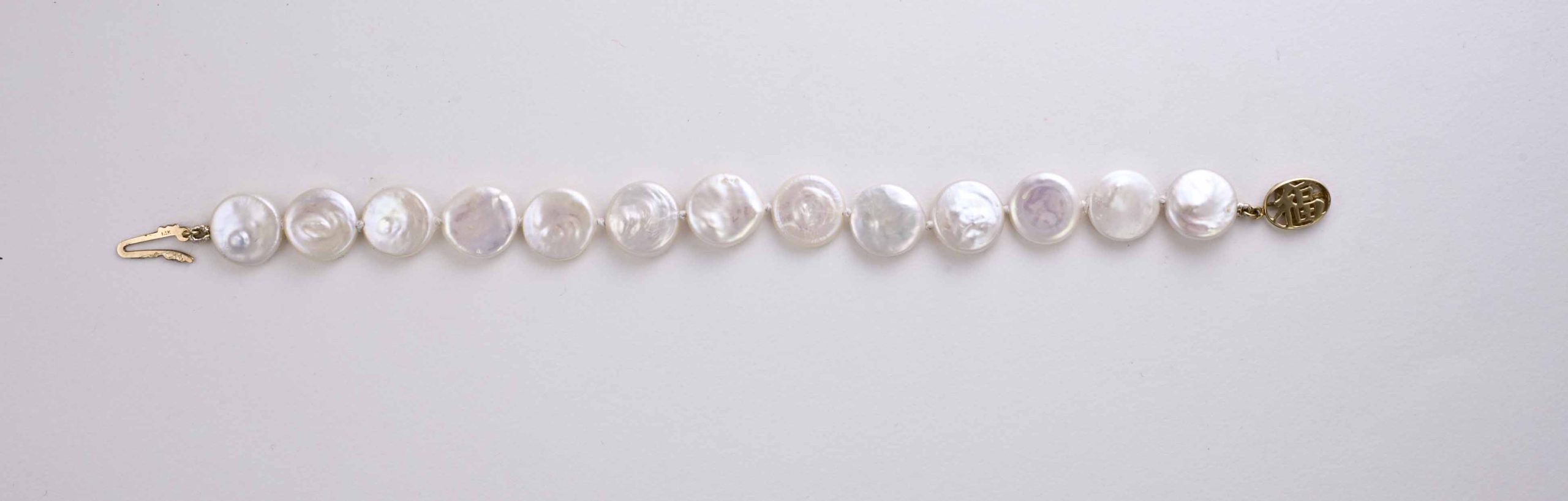 Extreme hi-luster. Large 14kt gold filigree clasp. 7.5″ in length.